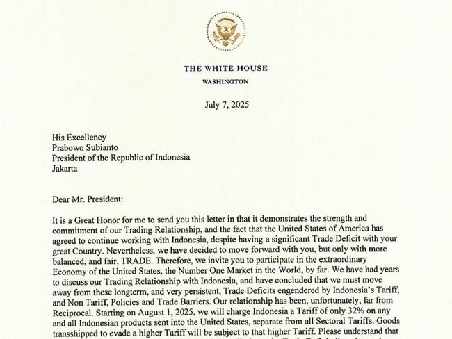 "Kami telah bertahun-tahun berdiskusi mengenai hubungan dagang dengan Indonesia dan kami menyimpulkan bahwa kami harus menjauh dari kebijakan jangka panjang yang sangat persisten yang menyebabkan defisit perdagangan besar karena tarif dan kebijakan non-tarif, serta hambatan perdagangan dari Indonesia. Hubungan kita sejauh ini sayangnya tidak bersifat timbal balik," ucap Trump.