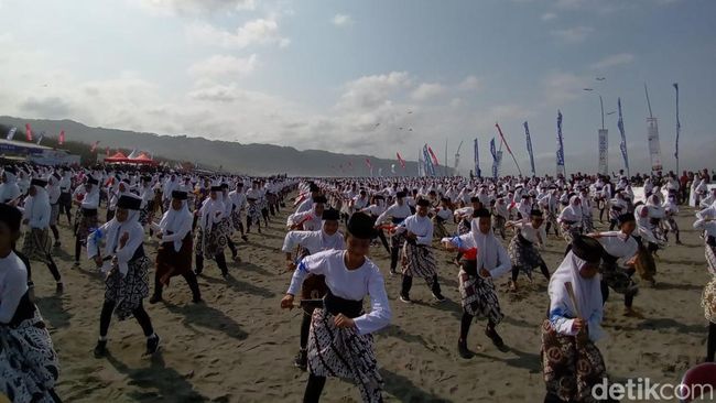 Pantauan detikJogja, tampak para siswi berbaris rapi di pinggir Pantai Parangkusumo. Mereka mengenakan kaus lengan panjang warna putih dibalut kain jarik kombinasi celana panjang.