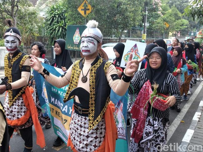 Pantauan detikJogja di sekitar Tugu Pal Putih, Rabu (4/10/2023), kirab kali ini diikuti para pelajar yang mengenakan pakaian adat Jawa hingga kostum tokoh pewayangan. Tampak pula beberapa dari mereka menenteng hasil bumi berupa sayur-mayur hingga gunungan dari aneka makanan ringan.
