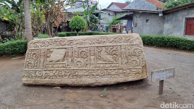 Tak hanya berwarna putih, batu yang bentuknya condong ke persegi panjang ini memiliki ukiran relief di setiap sisinya. Tampak pula papan bertuliskan 'dilarang naik/duduk" di atas batu'.