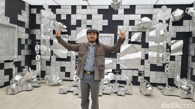"Bahan baku karya saya ini full aluminium lalu dikenteng. Nah, ini kenteng dengan metode pembuatan mal menggunakan kawat, jadi sebenarnya emboss tapi dengan teknik pengentengan," katanya saat ditemui di Jogja National Museum (JNM), Kota Jogja, Sabtu (10/8/2024).