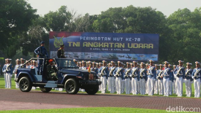 Jogja - Puncak HUT ke-78 TNI Angkatan Udara digelar di lapangan Akademi Angkatan Udara (AAU) Daerah Istimewa Yogyakarta (DIY), Senin (22/4/2024). Begini potretnya.