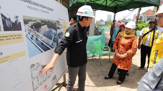 Bupati Sleman, Kustini Sri Purnomo meninjau langsung proses pengerjaan Pasar Godean, Kabupaten Sleman. Pasar tersebut ditarget akan selesai pada bulan Mei 2024 mendatang.