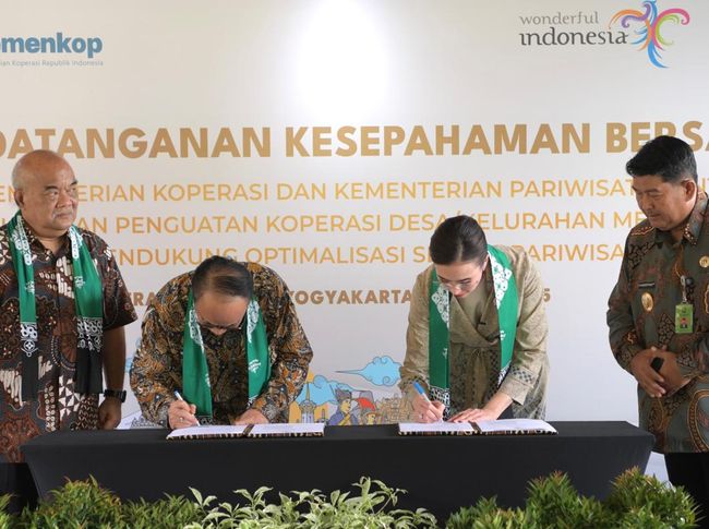 Kementerian Koperasi (Kemenkop) dan Kementerian Pariwisata (Kemenpar) menandatangani nota kesepahaman (MoU) tentang Koperasi Desa (Kopdes) Merah Putih. Sinergi dua kementerian ini diharapkan bisa menjadi penguatan Kopdes Merah Putih.