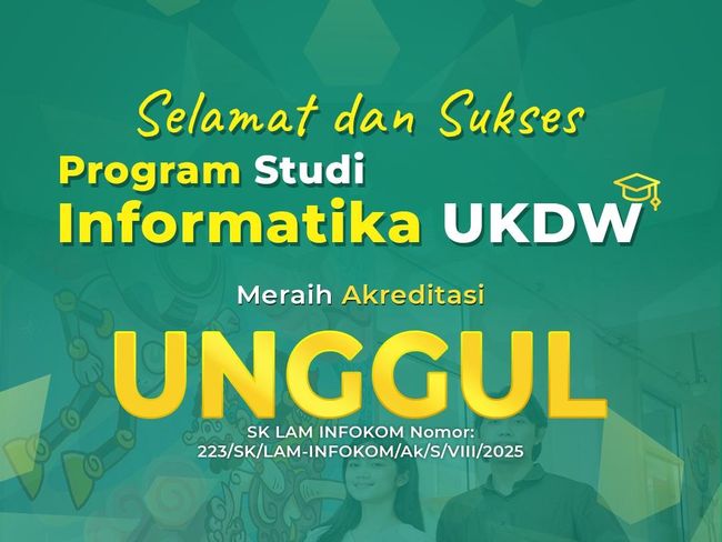Program Studi (Prodi) Informatika Fakultas Teknologi Informasi (FTI) Universitas Kristen Duta Wacana (UKDW) mendapat predikat Akreditasi Unggul dari Lembaga Akreditasi Mandiri Informatika dan Komputer (LAM INFOKOM). Predikat tersebut menjadi bukti kualitas pembelajaran hingga penelitian yang berstandar tinggi.