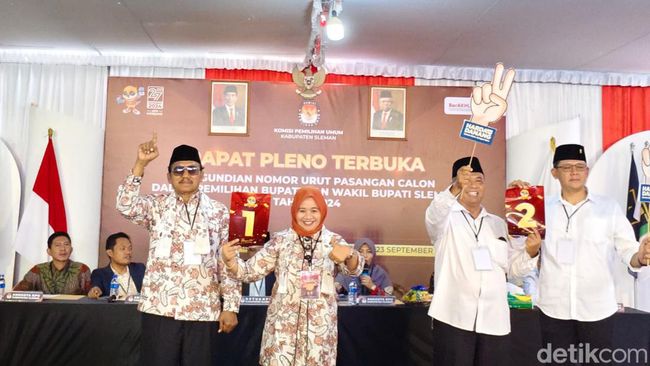 "Nomor urut 1 Pasangan Calon Bupati dan Wakil Bupati Dra. Hj. Kustini Sri Purnomo dan H. Sukamto, S.H. Nomor urut 2 Pasangan Calon Bupati dan Wakil Bupati Harda Kiswaya, S.E, M.Si dan Danang Maharsa, S.E dengan ini ditetapkan," kata KPU Sleman Ahmad Baehaqi, Senin (23/9/2024).