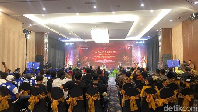 Kemudian pendukung paslon nomor urut 1 masuk mengenakan jaket berwarna biru dan lengan putih, di bagian punggung terdapat angka bertuliskan nomor 01. Lalu, pendukung paslon 3 mengenakan setelan batik bebas memasuki area debat paling terakhir.