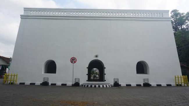 Dindingnya terbuat dari susunan bata berlapis semen merah setebal 130 cm. Setiap sisi bangunan memiliki satu pintu dan 2 buah jendela. Uniknya, semua pintu dan jendela pada bangunan ini memiliki bentuk yang sama, yaitu lengkung pada bagian atas dan hanya berupa lubang.
