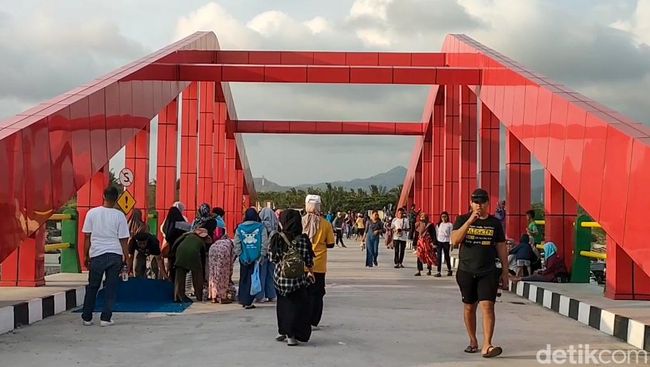 Pantauan detikJogja di lokasi siang ini, ratusan orang terlihat memadati kawasan jembatan. Tampak beberapa pengunjung asyik berswafoto dengan latar belakang jembatan dengan warna merah mencolok itu.