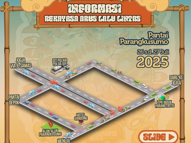 "Arus kendaraan dari arah TPR Induk dilarang belok kanan di simpang tiga JJLS ataupun di simpang tiga Hotel Gandung, nanti kendaraan diarahkan masuk melalui Pantai Parangtritis," katanya kepada wartawan di Bantul, Jumat (25/7/2025).