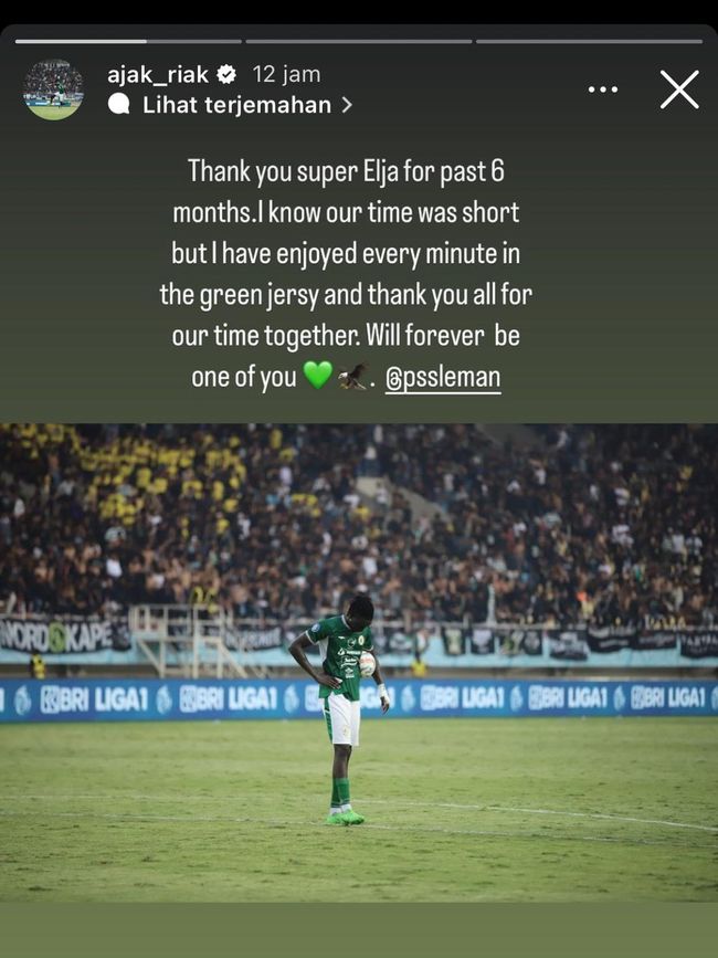 Ajak Riak mengumumkan salam perpisahan dengan PSS Sleman dalam Instagram Story pribadinya usai menghabiskan setengah musim membela Super Elang Jawa (Elja).