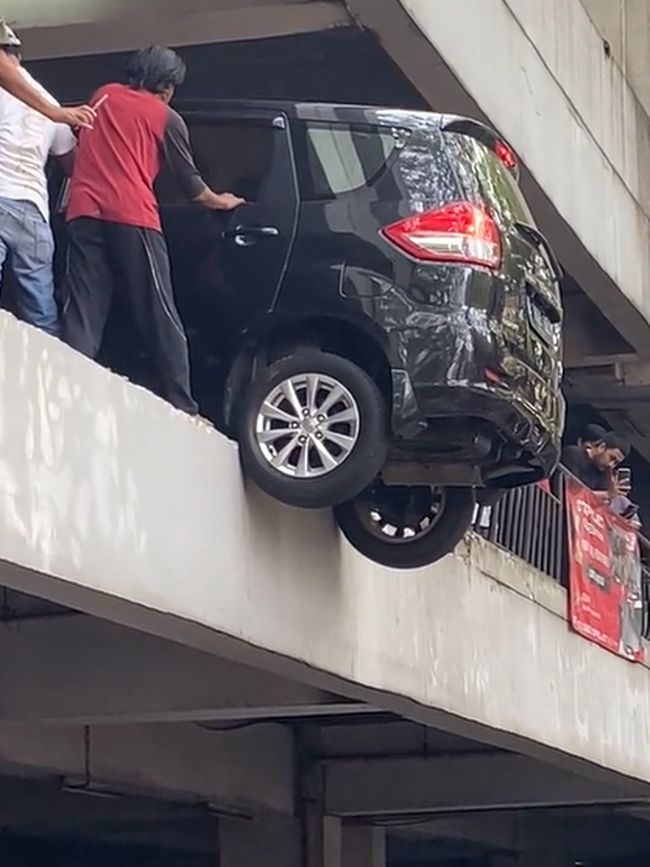 Sebuah mobil nyaris terjun dari lantai 2 parkiran di Tangerang Selatan, Sabtu (9/9/23). Disebutkan pengemudi mobil keliru saat menginjak gas.