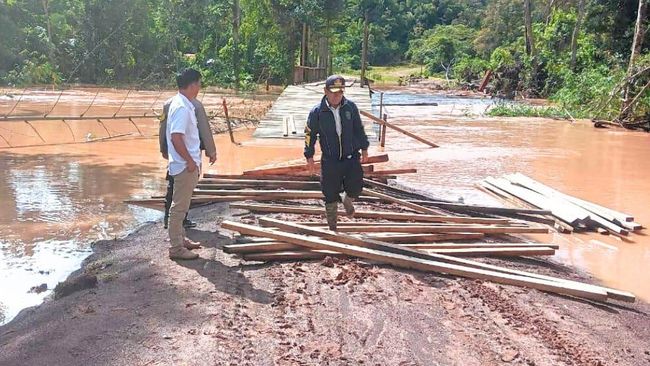 Jembatan alternatif yang baru dibangun BPBD Nunukan pada Maret 2025 ikut terdampak. Material kayu yang akan digunakan untuk atap jembatan terseret arus sungai.