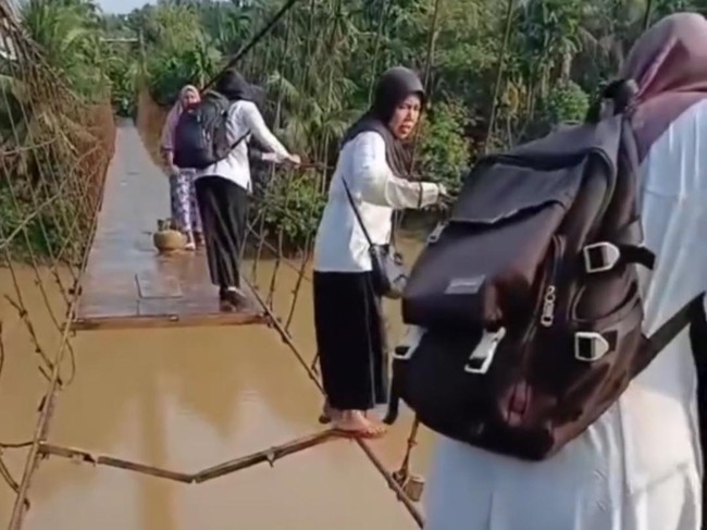 Rombongan guru perempuan di Merangin, Jambi melewati jembatan rusak yang tampak mengerikan. Videonya pun kemudian viral di media sosial.