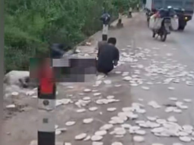 Tabrakan ini menyebabkan kedua kendaraan masuk ke parit di tepi jalan. Dagangan kerupuk pengendara motor juga berceceran di jalan.