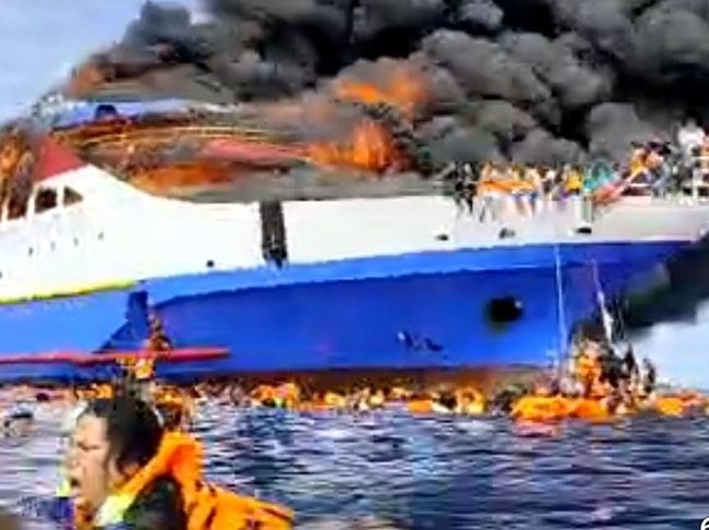 Sejumlah penumpang meloncat ke laut. Tampak beberapa penumpang menggunakan pelampung sembari berenang menyelamatkan diri menjauh dari kebakaran.
