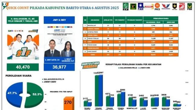 "Versi Real Count adalah data yang masuk bersumber dari Saksi Paslon 01, di Barito Utara sebanyak 270 TPS," ujarnya saat dikonfirmasi Rabu (6/8/2025) malam.
