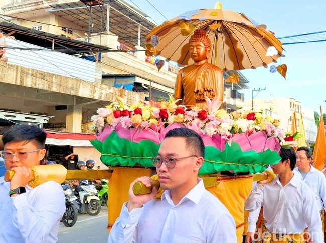 Acara dimulai sekitar pukul 16.00 Wita dengan suasana penuh makna. Sebelum memulai arak-arakan, panitia membagikan bunga sedap malam dan lilin kepada umat, baik tua maupun muda. Prosesi diawali dengan pelepasan sejumlah burung sebagai simbol kebebasan dan kebajikan. Kemudian, arak-arakan Buddha Rupang dimulai menempuh jarak sekitar 3-5 kilometer dengan berjalan kaki, diiringi kesenian barongsai yang memeriahkan suasana.