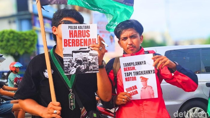 Peserta aksi membawa beragam poster dan spanduk bertuliskan seruan mundur untuk Kapolda Kaltara. Koordinator Lapangan LBH Hantam, Dicky Nur Alam, menyatakan aksi ini sebagai respons atas buruknya kepemimpinan Kapolda yang menjabat sejak 2024. Foto: Oktavian Balang/detikKalimantan