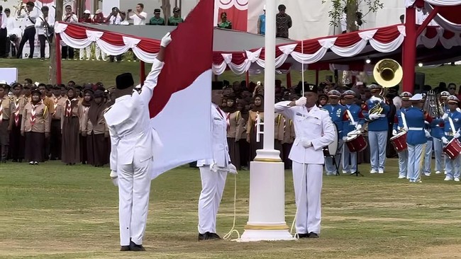 Upacara HUT ke-80 RI digelar di Ibu Kota Nusantara (IKN), Kalimantan Timur, Minggu (17/8/2025). Meski tanpa kehadiran pejabat pemerintah pusat, prosesi tetap berlangsung khidmat, sekaligus meriah dengan melibatkan ribuan peserta dari berbagai daerah.
