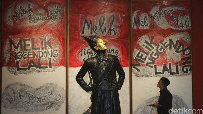 Sosoknya kayak Petruk berwarna hitam, tapi wajahnya emas. Wajahnya juga agak mendongak sambil bertolak pinggang. Di belakangnya, ada tiga lukisan besar banget dengan dominasi warna merah putih dengan tulisan 'Melik Nggendong Lali', apa maknanya ya?