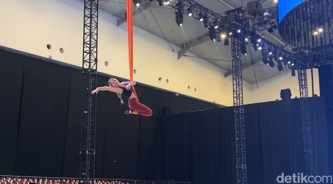 Dalam beberapa sesi, para pemain juga terlihat terbang dengan properti tersebut. Ada juga sesi latihan saat mereka sedang lakuin aerial lyra hoop yang mengudara ke langit-langit Hall 10 ICE BSD, Tangerang. Keren banget aksi mereka, detikers!