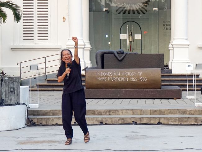 Di sampingnya ada Monumen Pembantaian Massal Indonesia 1965-1966 yang terbuat dari fiberglass. Patungnya gambarin wanita telungkup di atas peti mati dan buku tebal. Bukunya bertuliskan Indonesian History of Mass Murdered 1965-1966.