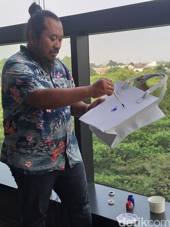 Dalam workshop melukis bareng media tersebut, Yahya membuat goresan abstrak dengan warna biru dan merah. Sekilas gambarnya di atas tas jinjing beludru sangat artistik dan komposisinya pas.