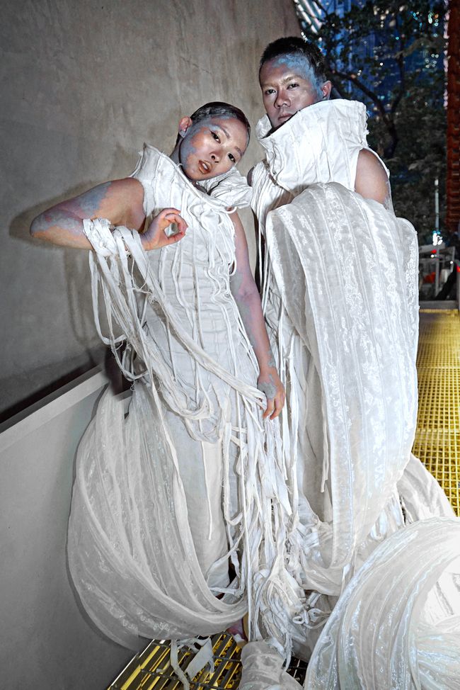 Awalnya Jessica menaiki salah satu tembok di lantai 2 kedai tersebut. Dari arah panggung, dua orang penari yang tertutup oleh busana zero waste karya Ayudya Paramitha atau dikenal sebagai pencipta Hlaii (baca Helai), tampak tertutup seluruh badannya.