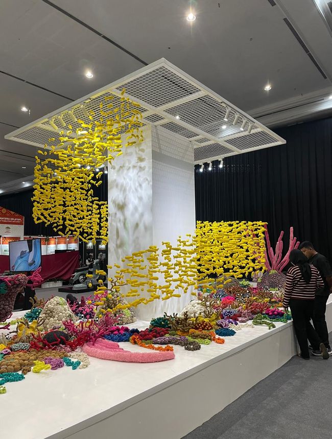 Balutan benang warna-warni dengan konsep dunia bawah laut membuat banyak pengunjung ingin menghampiri dan penasaran dengan instalasi ini. Gak heran, banyak pengunjung yang berusaha mengabadikan momen bersama karya Mulyana ini.