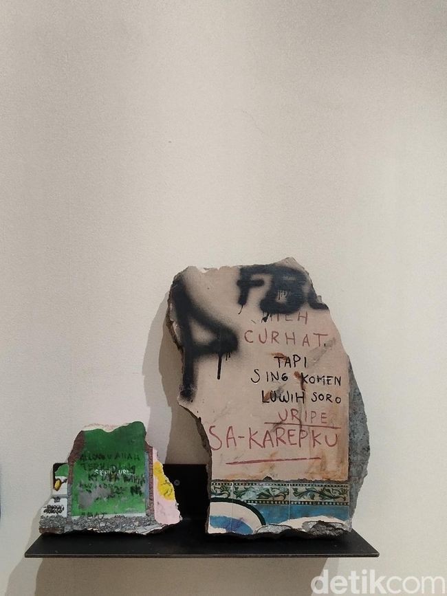 Uniknya, Begok Oner mengambil tembok bekas reruntuhan dinding di area tersebut lalu menggambar di atasnya. Ada mural yang bertuliskan kata-kata keresahan tersebut, ada juga gambar kondisi kota pelajar tersebut. Karya itu diberikan judul dengan titik koordinat.
