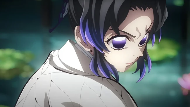 Shinobu Kocho yang identik dengan aksesori bunga dan Haori sama seperti kakaknya Kanae Kocho, terkejut dengan Douma yang ada di depannya. Dalam momen berikutnya, Shinobu tersadar itu adalah iblis yang membunuh kakaknya, ia pun langsung melancarkan serangan mematikan.