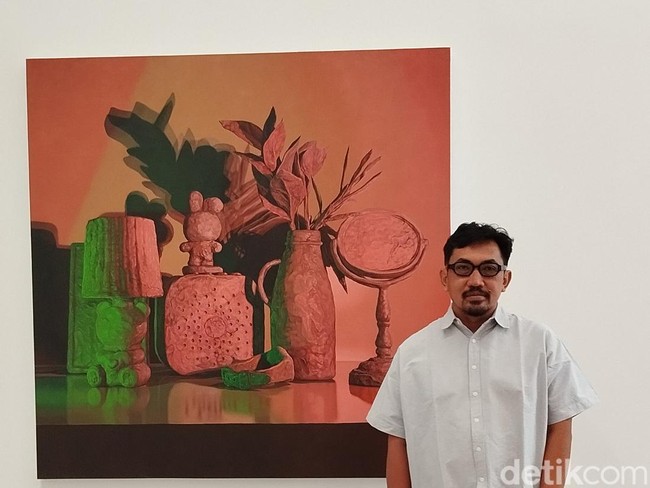 "Di antara dua dunia itu kan sekarang manusia hidupnya memang antara dunia nyata dan dunia maya ya. Terjadilah cahaya pink, warna magenta juga. Jadi saya buatnya seperti pertunjukan, lalu baru melukis," ungkap Wedhar.