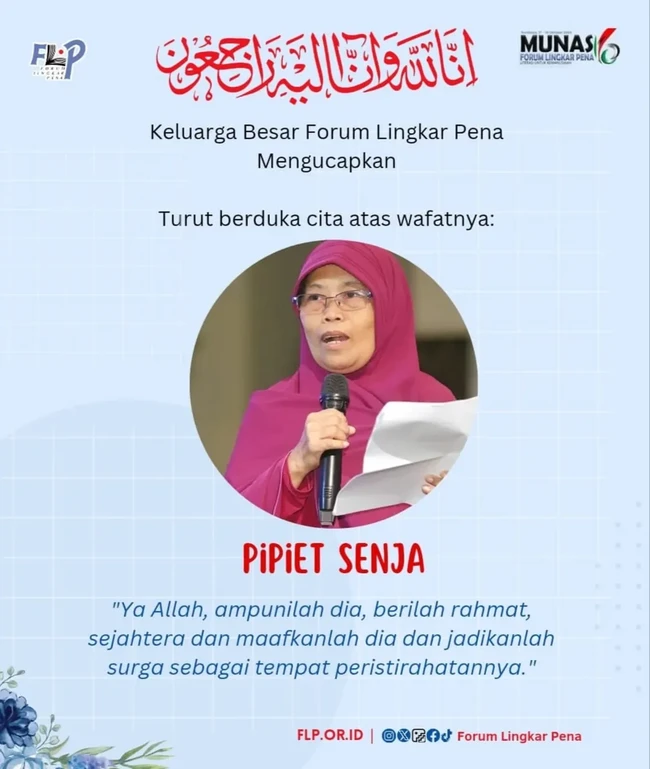 "Keluarga besar Forum Lingkar Pena mengucapkan turut berduka cita atas wafatnya Pipiet Senja (Etty Hadiwati Arief). Allahummaghfirlahu, warhamha, wa 'afihi, wa'fu 'anha. Semoga Allah SWT menerima amal baiknya dan mengampuni segala dosanya. Diluaskan dan diterangi kuburnya. Aamiin," tulis FLP.