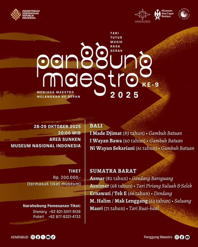Panggung Maestro kembali diselenggarakan di edisi ke-9 pada 28-29 Oktober 2025 di Museum Nasional Indonesia, Jakarta. Maestro seni tradisi dari Bali dan Sumatera bakal unjuk gigi tepat pukul 20.00 WIB.