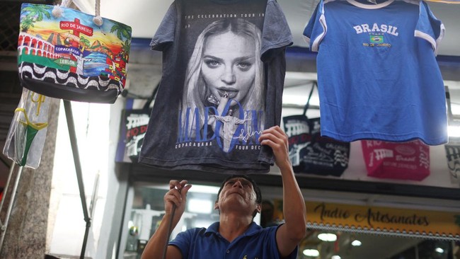 Brasil - Superstar pop Madonna akan mengadakan konser pada 4 Mei di pantai berpasir Pantai Copacabana. Merchandise dirinya pun banyak dijajakan jelang konser.