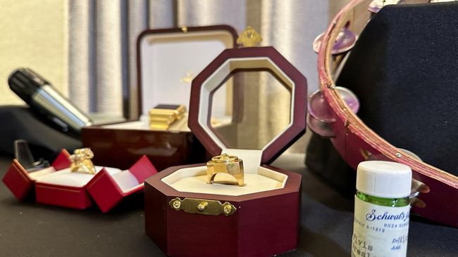 Perhiasan dan botol pil Elvis Presley dipajang sebelum penjualan Artifacts of Hollywood & Music oleh GWS Auctions, di New York City, New York, AS. Di antara lot teratas terdapat beberapa barang milik Presley, termasuk mikrofon dari tempat tinggal artis tersebut di Las Vegas, botol pil bertanda Maret 1977, dan dua cincin emas unik, yang diperkirakan akan terjual seharga $35.000 hingga $60.000.