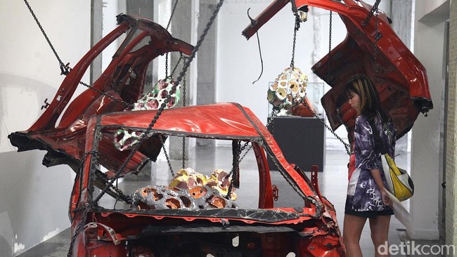 Pengunjung melihat karya seni dalam pameran tunggal Hyun Nahm 'Kawah Ojol' di Jakarta, Jumat (29/11/2024).