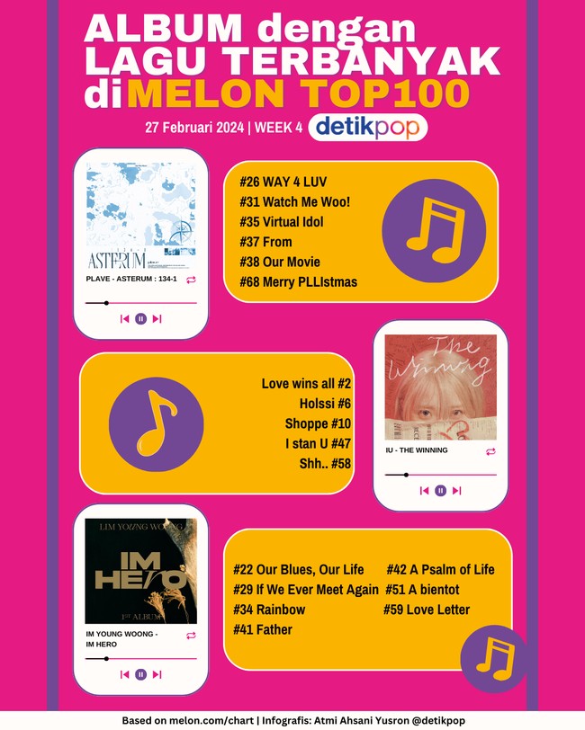 Update for YOU today, Melon geeks! Di infografis kali ini, detikpop menyoroti album-album yang tracklist-nya palling banyak masuk ke chart Melon Top 100. Di pekan keempat Februari 2024 ini, ada IU, Lim Young Woong (yang sudah ada sejak lamaaaaaaa sekali), dan yang terbaru adalah PLAVE! Virtual idol ini baru saja merilis album berjudul 'ASTERUM : 134-1' yang pada Selasa (27/2/2024), semua lagu-lagu di album itu charted di Melon Top 100. Keren abis!