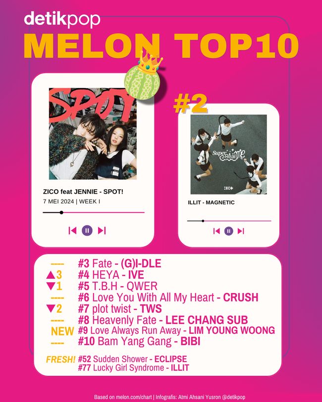 Jakarta - New day, news song on Melon Top 10. Pekan ini IVE menembus 10 besar dengan lagu terbarunya HEYA. Lagu lama Im Young Woong juga meroket ke atas setelah perilisan single baru dari album berjudul Warmth. Simak 10 lagu terbaik di chart Melon Top 100 pekan ini dalam infografis di atas!