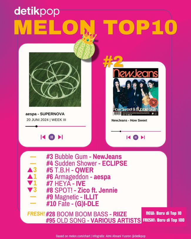 Jakarta - Memasuki pekan ketiga Juni, chart Melon Top 100 masih didominasi oleh nama-nama seperti aespa, NewJeans, QWER, hingga ECLIPSE di posisi teratas. Pekan ini RIIZE datang dengan single fresh mereka BOOM BOOM BASS yang menempati peringkat #28 pada Kamis (20/6/2024). Lagu ini menyusul sederet single RIIZE dari album terbaru RIIZING yang juga sudah nangkring di chart sejak beberapa pekan terakhir seperti Impossible dan Siren. Pendatang baru lain pekan ini adalah kolaborasi Huh Gak, Onestar, Lee Mujin, Lee Jin Sung, Kim Hee Jae, dan An Nyeong menyanyikan cover lagu Standing Egg berjudul Old Song. Lagu ini menempati urutan #95.
