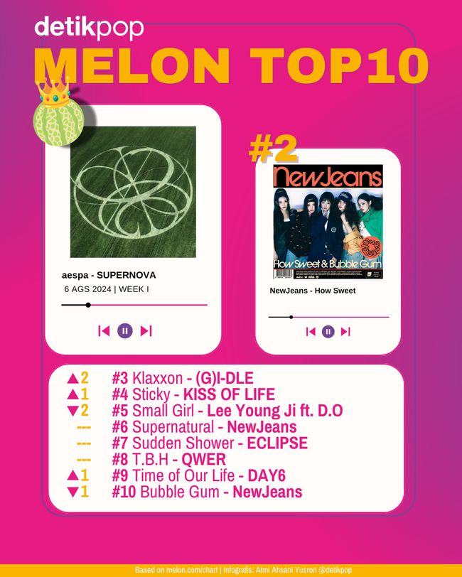 Jakarta - Nggak ada lagu baru di chart Melon Top 100 edisi Selasa (6/8/2024). 100 lagu terpopuler di Korea Selatan pekan ini masih sama dengan pekan lalu dengan aespa juara di posisi #1 lewat Armageddon dan Jimin BTS menutup chart dengan Who di posisi #100. Tapi persaingan di 10 besar masih terasa sengit. Pekan ini lagu Klaxxon milik (G)I-DLE menunjukkan performa terbaik mereka dengan meroket ke posisi #3, membayang-bayangi NewJeans yang sudah bertahan beberapa pekan di posisi runner up. (G)I-DLE berhasil menggeser Lee Young Ji feat. Doh Kyung Soo dengan lagu Small Girl mereka yang viral.