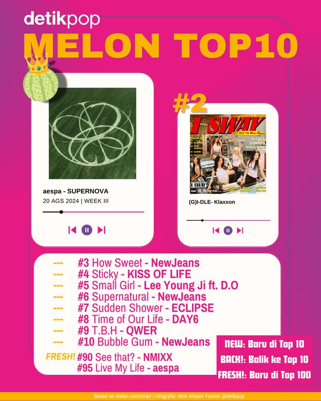 Simak 10 lagu terbaik di Melon Top 100 lewat infografis di atas, atau dengarkan 100 lagu terpopuler di Korea Selatan lewat playlist detikpop di bawah ini: