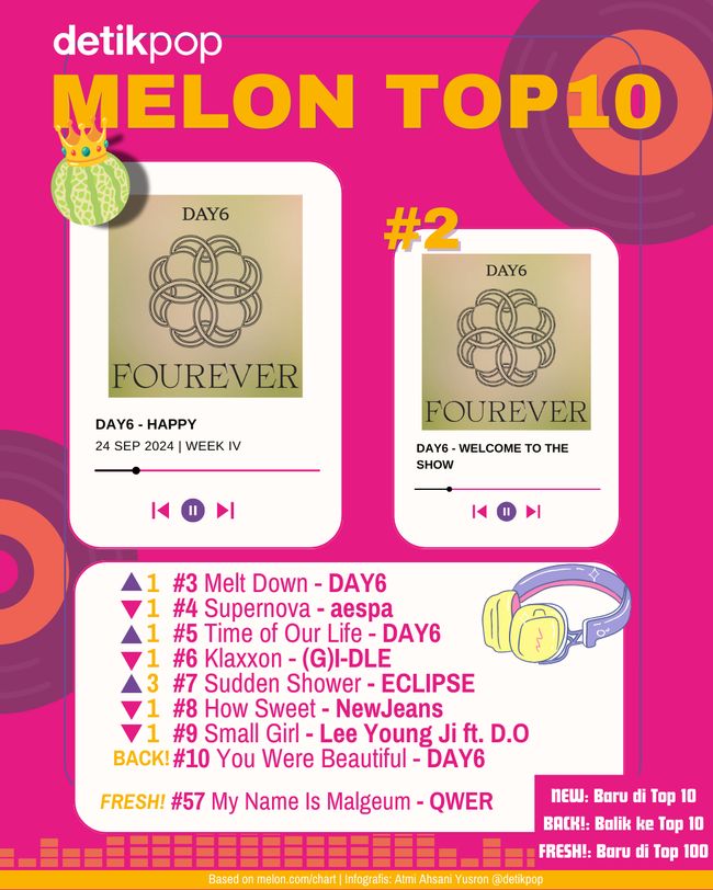 Pekan ini DAY6 masih juara di chart dan nggak banyak perubahan yang terjadi di 10 besar, kecuali lagu lama DAY6 You Were Beautiful kembali ke top 10. Simak daftar 10 lagu terbaik di Korea Selatan pekan ini lewat infografis di atas dan dengarkan 100 track di Melon Top 100 di playlist berikut ini: