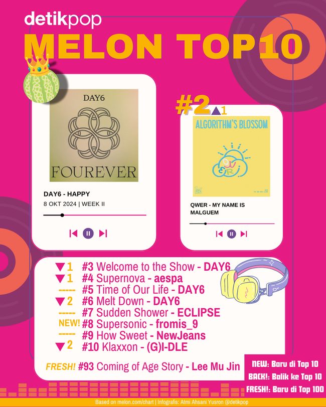 Tapi di posisi 10 besar ada pergerakan yang sangat berarti. QWER mencapai puncak baru di chart Melon lewat lagu mereka My Name Is Malguem yang pekan lalu menjejak di top 5, sekarang langsung bersaing dengan DAY6 di peringkat #2. Bukti kalau girlband ini memang lagi disayang banget sama pendengar musik lokal. Selain QWER, girlband fromis_9 juga menjejak di puncak baru buat lagu Supersonic. Pekan ini lagu tersebut duduk di peringkat #8 yang otomatis menggeser lagu lain seperti NewJeans dan (G)I-DLE.