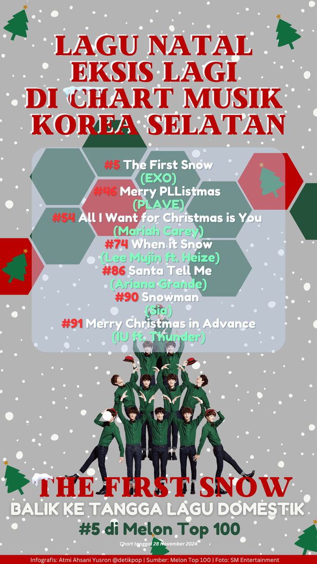 Jakarta - Lagu The First Snow (2013) milik EXO kembali ke chart domestik Korea Selatan awal pekan ini, menempati peringkat #83 pada Rabu (26/11) lalu. Berselang beberapa hari kemudian lagunya makin banyak didengarkan seiring dengan makin banyak pula challenge media sosial. Hasilnya The First Snow meroket ke posisi #5 di chart Melon Top 100 pada Kamis (28/11/2024). Selain EXO, ada beberapa lagu Natal lainnya yang udah siap-siap taking over the chart selama sebulan-dua bulan ke depan. Simak infografis di atas!
