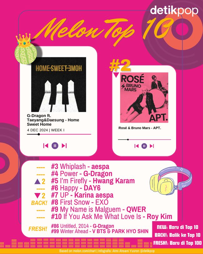 Simak 10 lagu teratas di chart Melon lewat infografis di atas (dengan BIGBANG masih jadi juara), dengarkan 100 lagu terpopuler di Korea Selatan dalam playlist di bawah ini:
