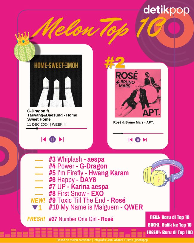 APT. masih unggul dari semua track lain. Lagu yang dinyanyikan Rosé bersama Bruno Mars ini ada di posisi #2 setelah berminggu-minggu jadi juara. Di 10 besar masih ada lagu andalan dari album 'rosie' berjudul Toxic Till The End. Pada Rabu (11/12/2024) lagu ini ada di posisi #9.