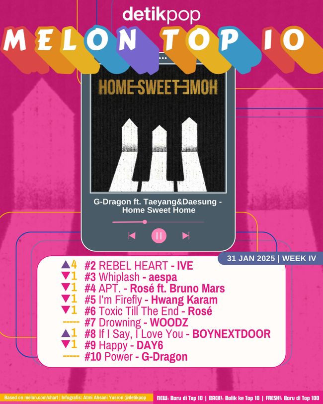 Sesuai prediksi minggu lalu, lagu REBEL HEART milik IVE berhasil ngegas sampai ke posisi #2. Mereka masih dihadang oleh G-Dragon dengan lagu HOME SWEET HOME (dinyanyikan bareng Taeyang dan Daesung) yang masih bertahan di posisi #1.