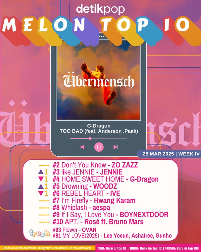 Jakarta - Girlband Starship Entertainment, KiiiKiii, akhirnya resmi merilis album debut mereka UNCUT GEM dengan title track BTG. Single baru itu belum nongkrong di chart Melon Top 100 pada Selasa (25/3/2025) tapi perilisan albumnya bikin single I DO ME kegenjot naik. I DO ME mencapai puncak tertingginya di chart pekan ini menempati peringkat #12. Simak 10 lagu terbaik di Korea Selatan saat ini dalam infografis di atas.